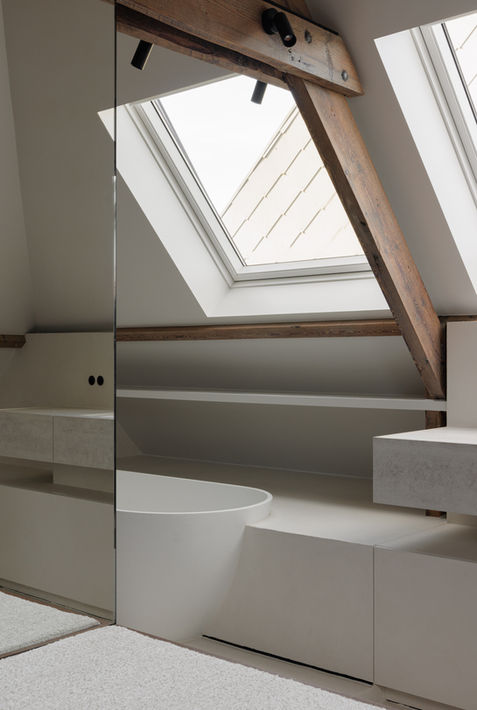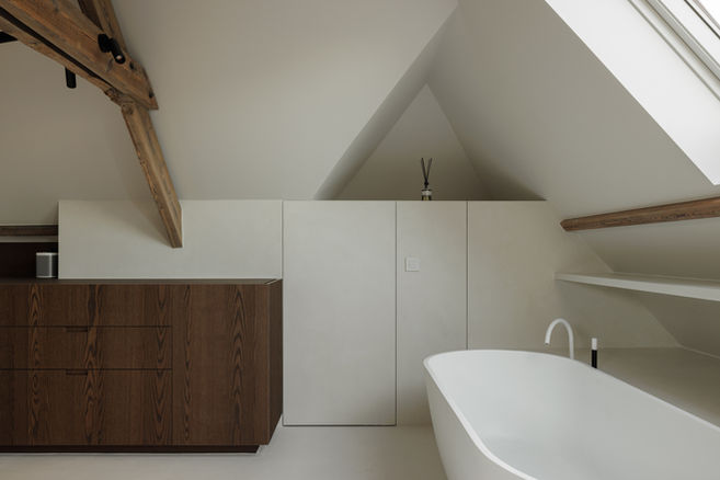 onder het dak, tussen historische balken en zacht daglicht, krijgt deze badkamer een serene,